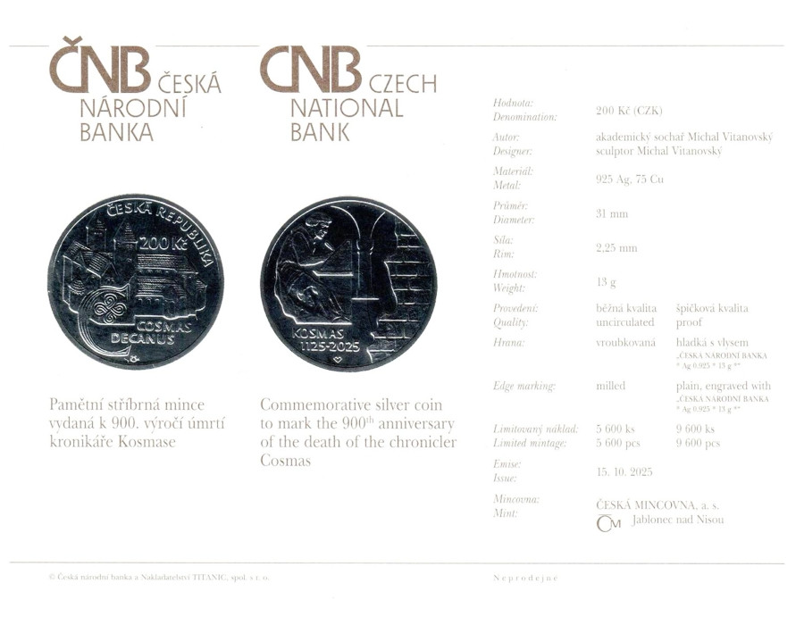 Dňa 21. 10. 2025 vydáva Česká národná banka pamätnú striebornú dvestokorunovú mincu pri príležitosti 900. výročie úmrtia kronikára Kosmasa.