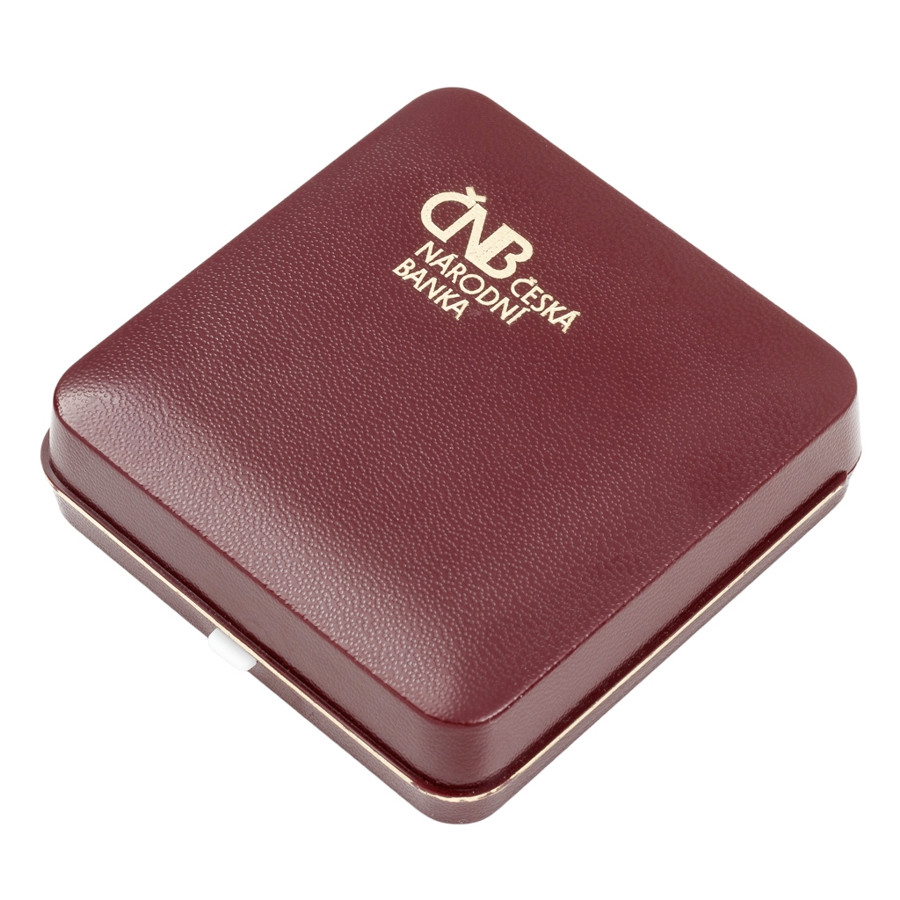 Minca je uložená v červenom puzdre so zlatým logom ČNB.